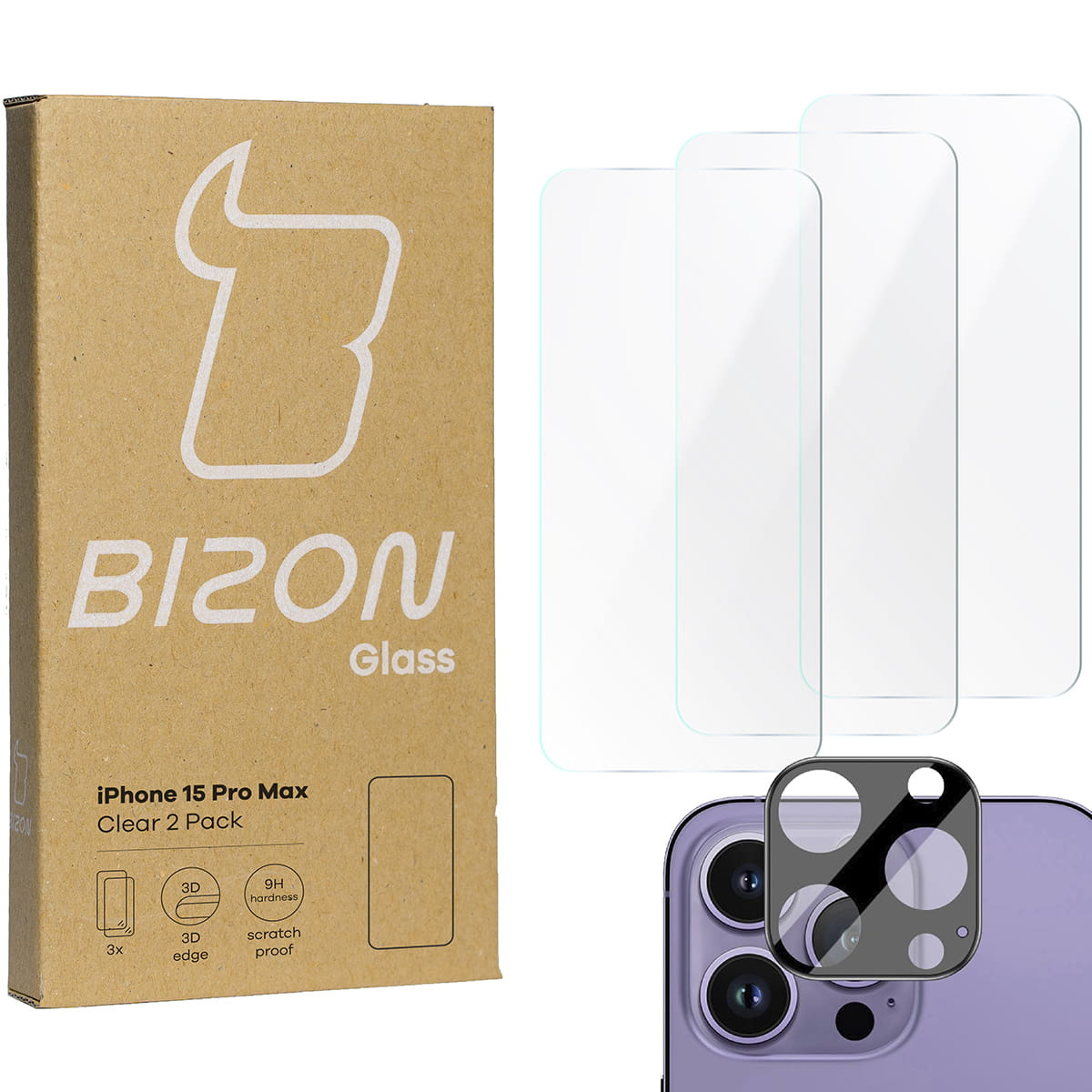 3x Szkło + szybka na aparat BIZON Clear 2 Pack do iPhone 15 Pro Max