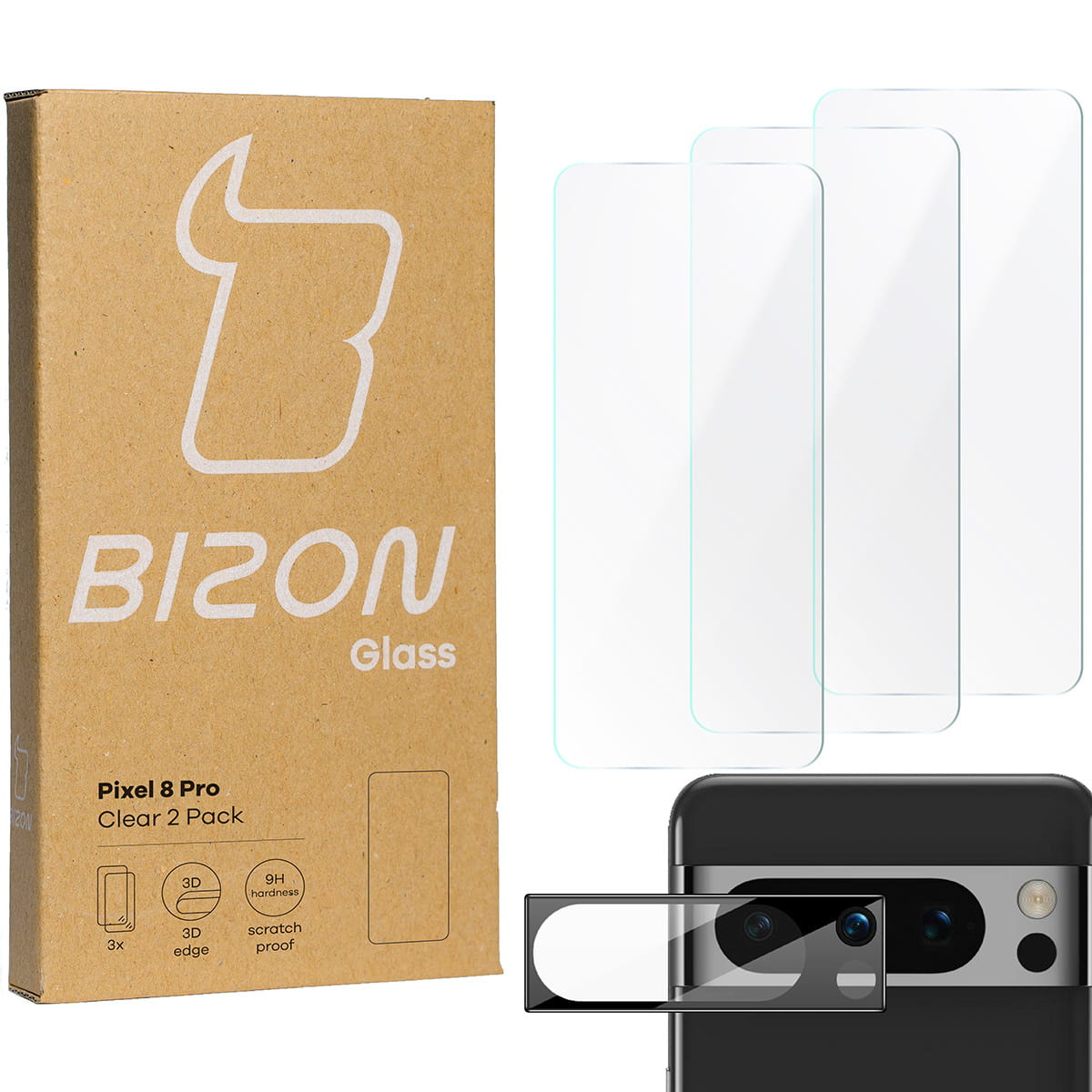 - 3X Szybka + szkło na aparat BIZON Clear 2 Pack do Pixel 8 Pro