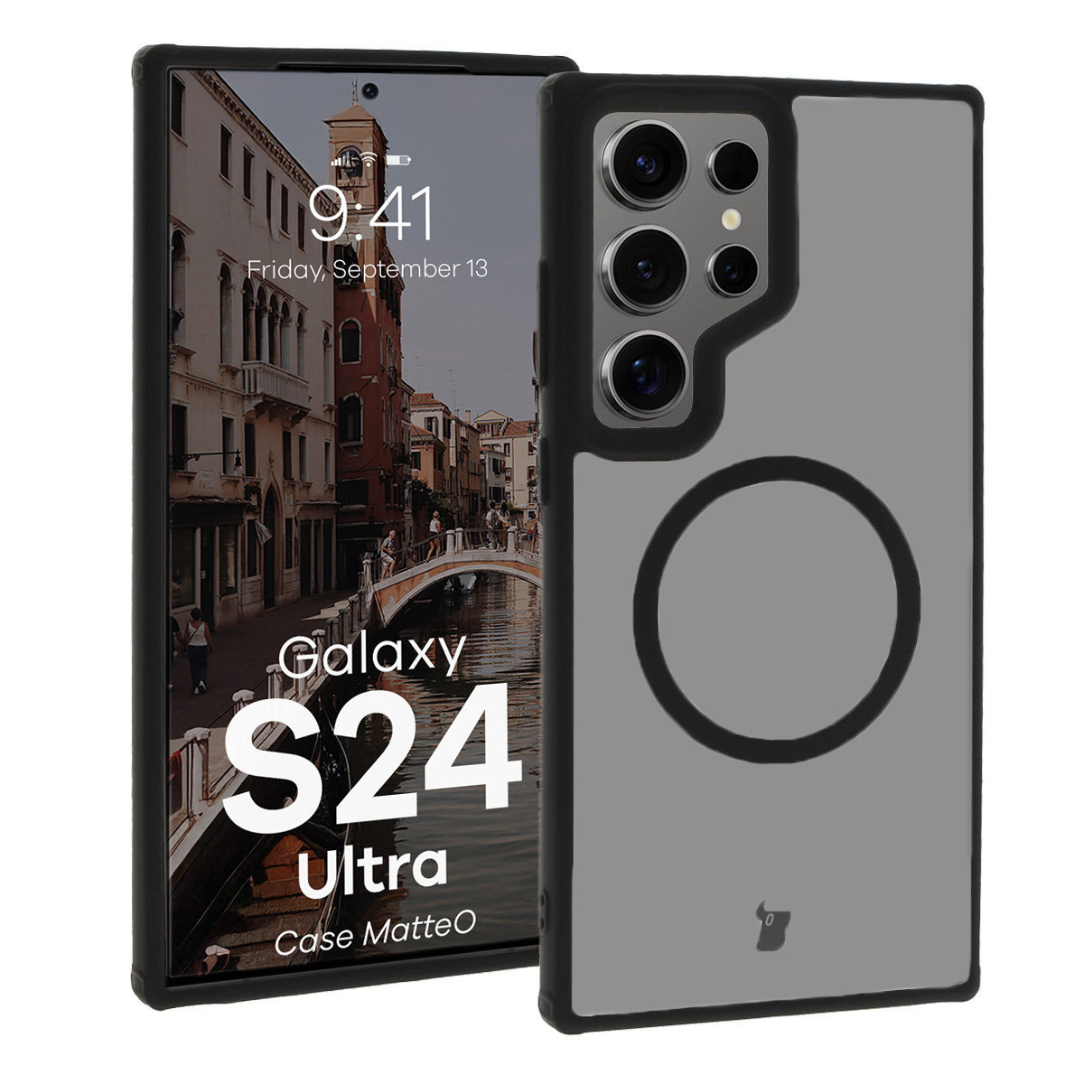 Etui z pierścieniem magnetycznym Bizon Case MatteO do Samsung Galaxy S24 Ultra, półprzezroczyste z czarną ramką