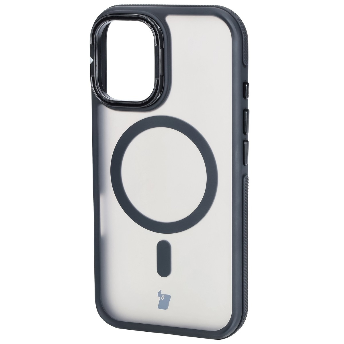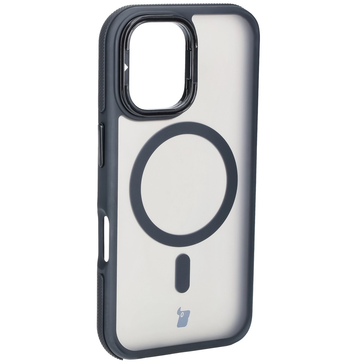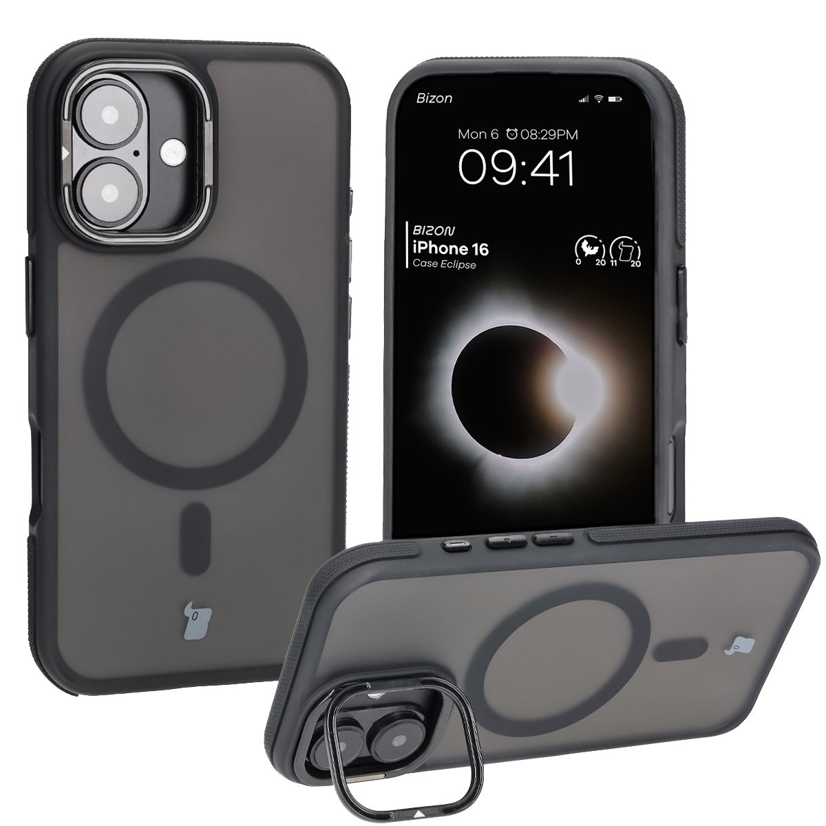 Etui z podstawką i pierścieniem magnetycznym Bizon Case Eclipse do iPhone 16, przydymione z czarną ramką