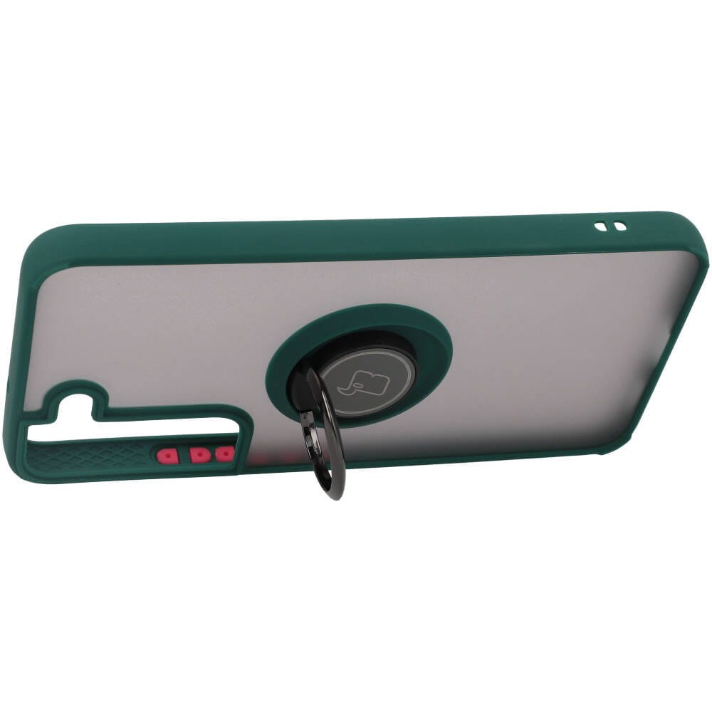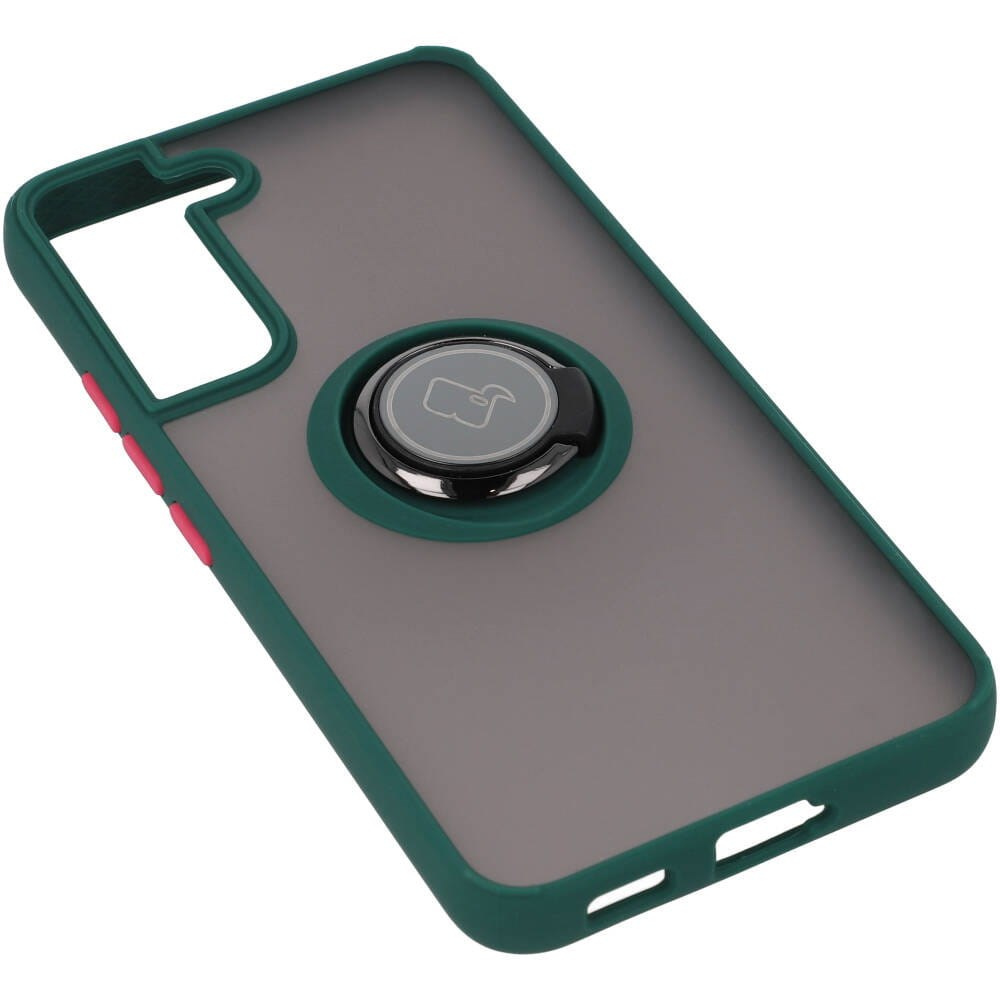 Etui z uchwytem na palec Bizon Case Hybrid Ring do Galaxy S22, przydymione z ciemnozieloną ramką