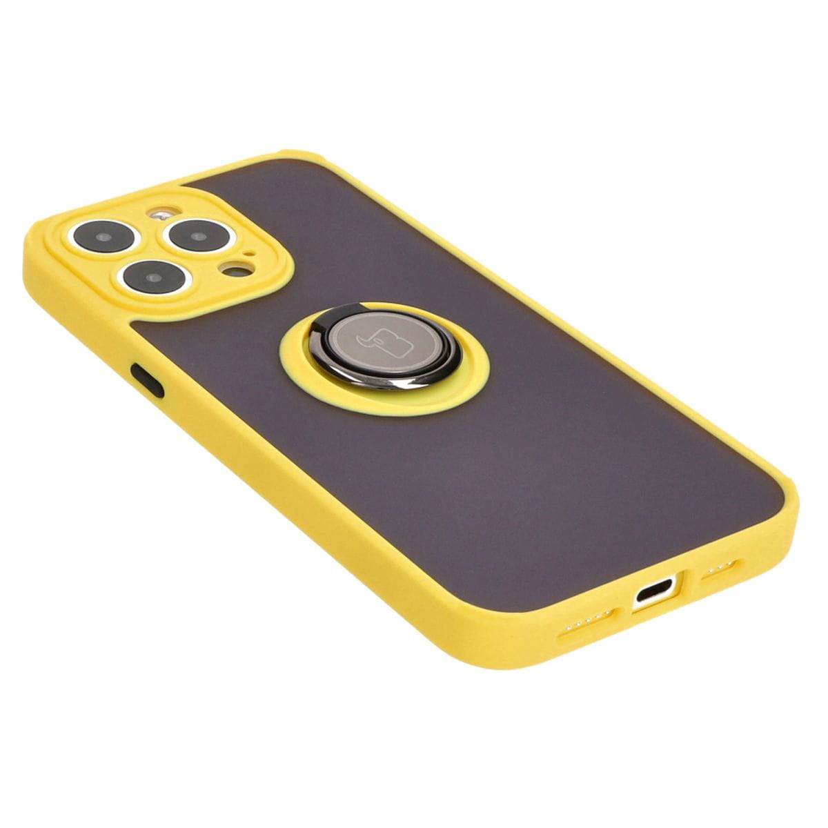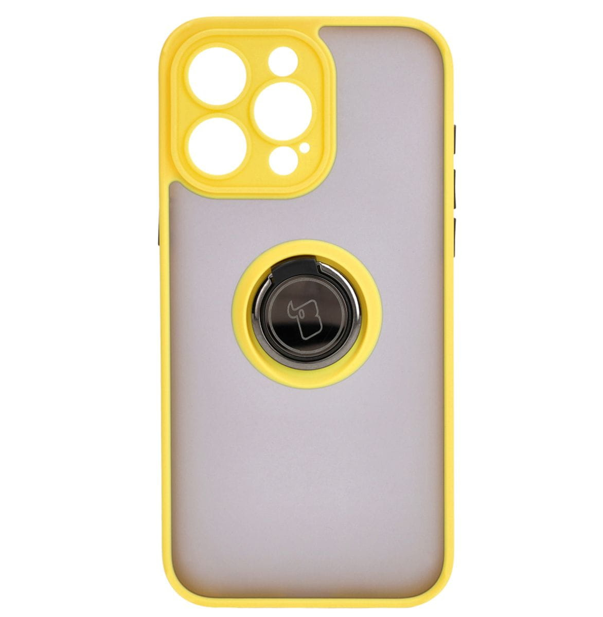 Etui z uchwytem na palec Bizon Case Hybrid Ring do iPhone 15 Pro Max, przydymione z żółtą ramką