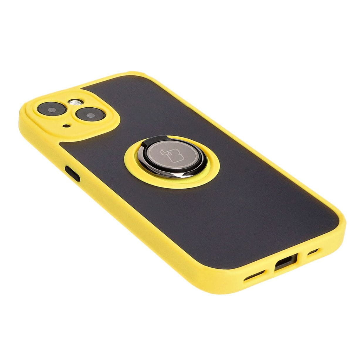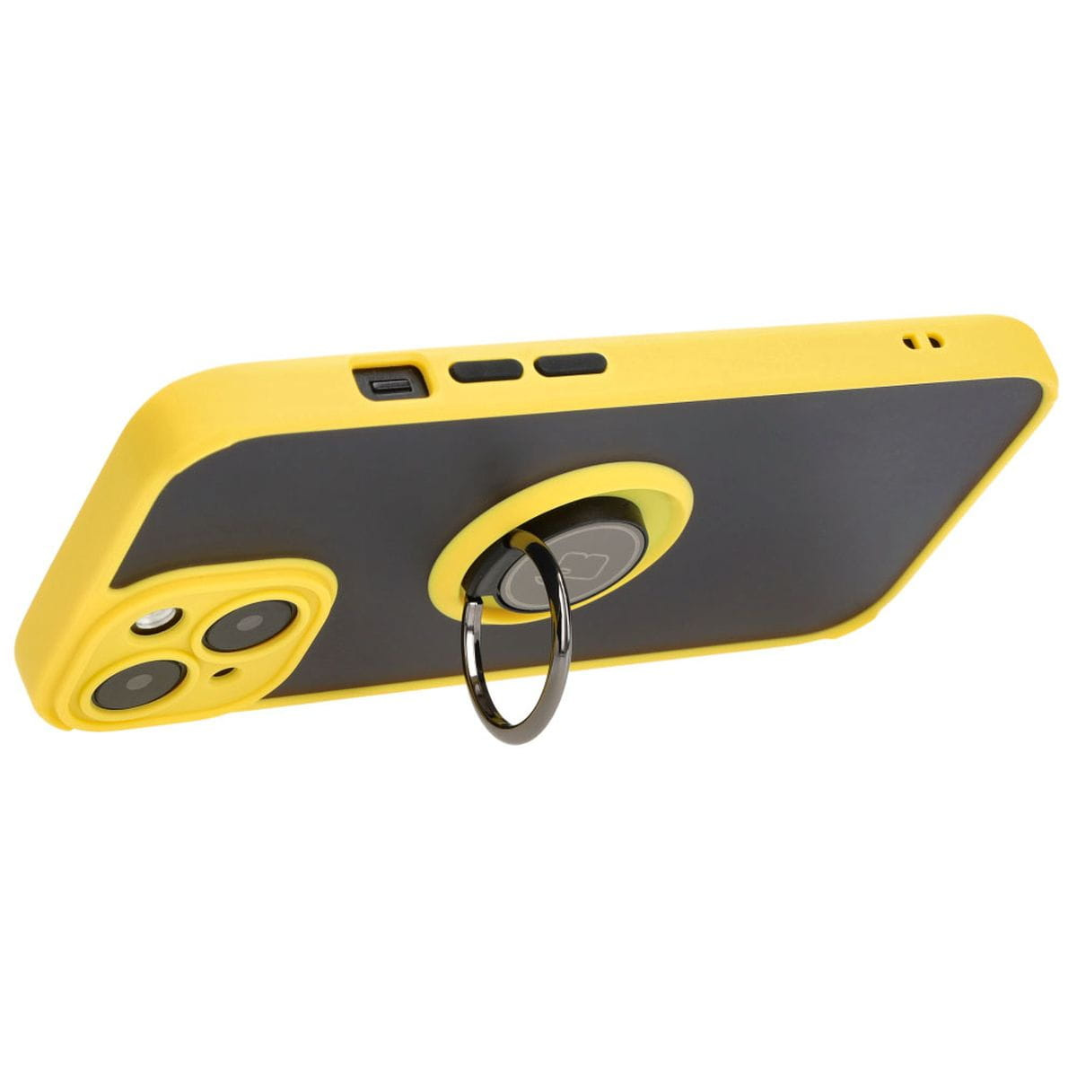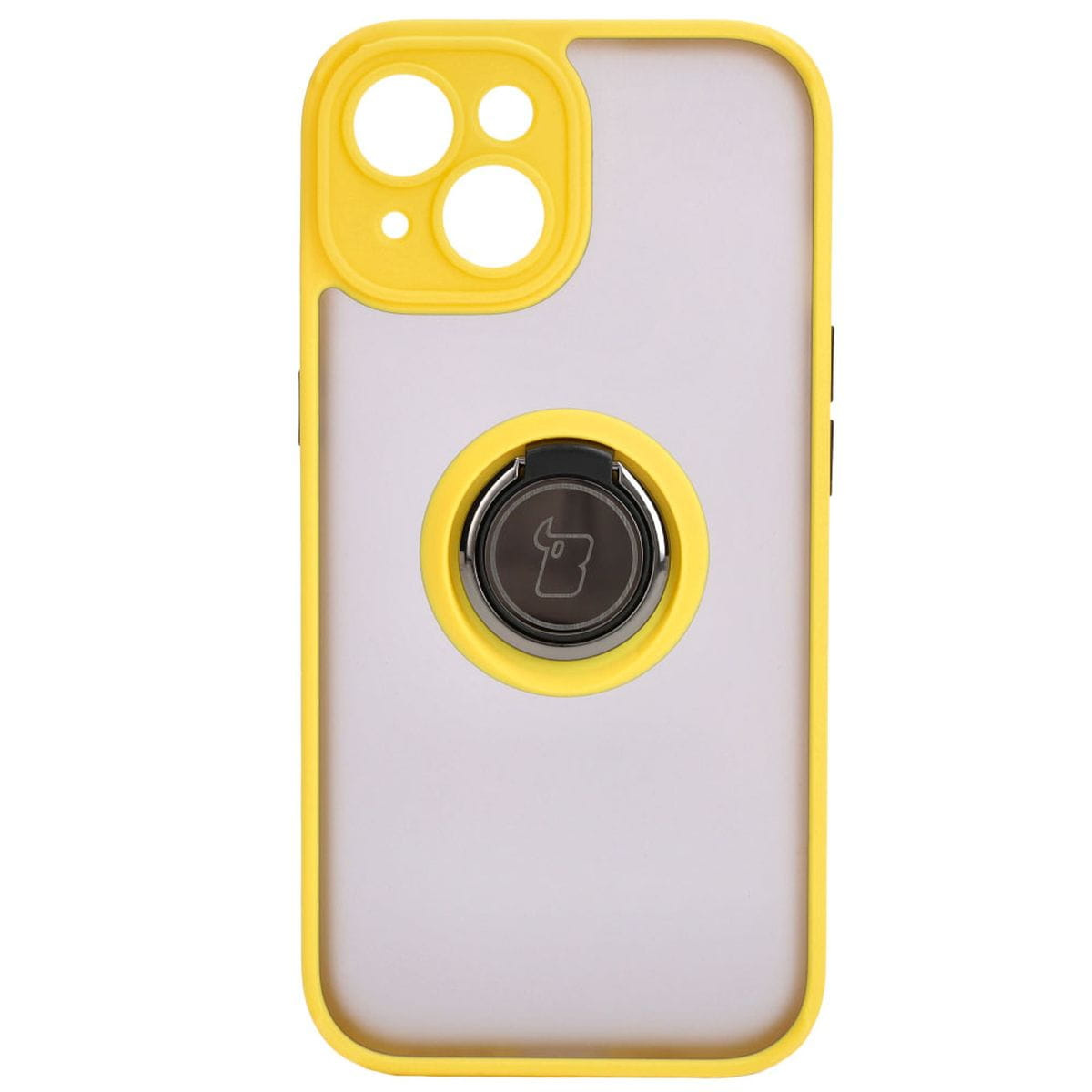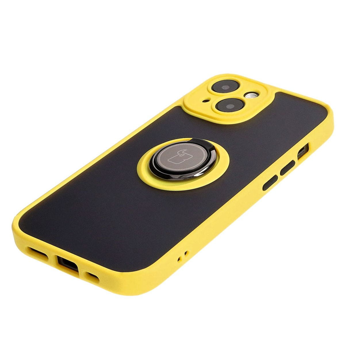 Etui z uchwytem na palec Bizon Case Hybrid Ring do iPhone 15, przydymione z żółtą ramką