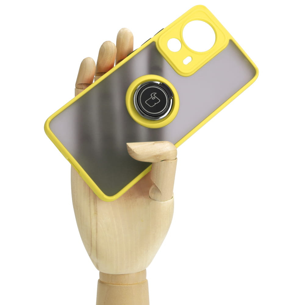 Etui z uchwytem na palec Bizon Case Hybrid Ring do Xiaomi 13 Lite, przydymione z żółtą ramką