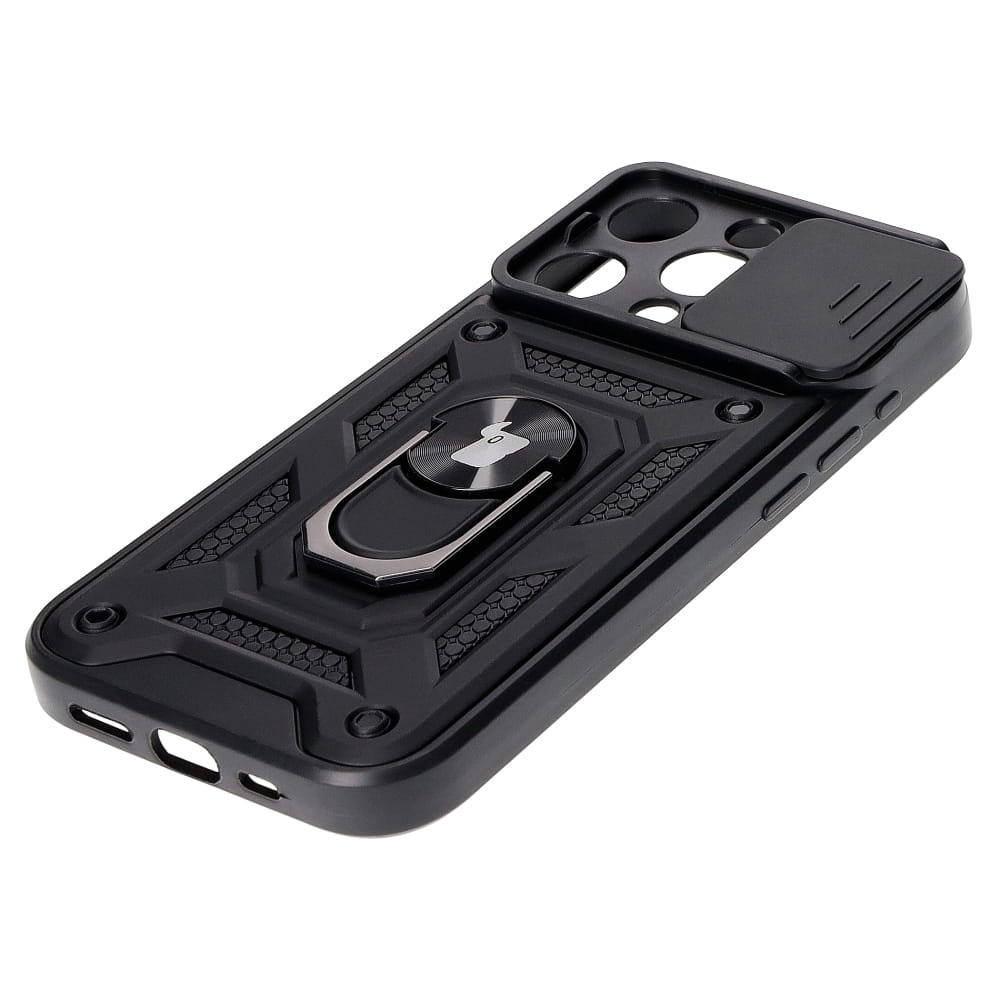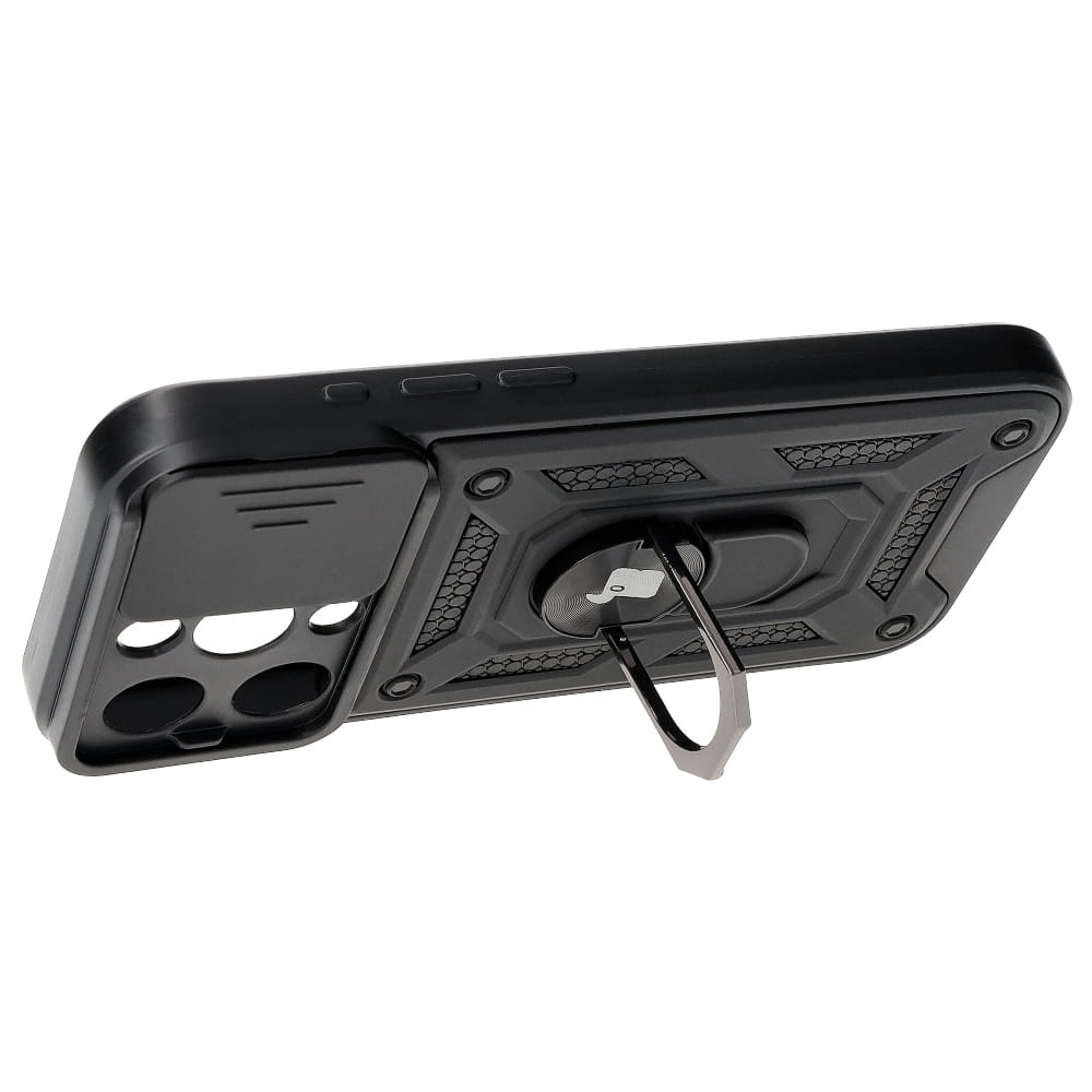 Etui cechuje obrotowy uchwyt na palec oraz przesuwany slider zapewniający ochronę wyspy aparatów. Wzmocniona konstrukcja etui sprawdzi się do ochrony telefonu przed wstrząsami, a dodatkowym atutem jest utrzymana płynność działania przycisków.