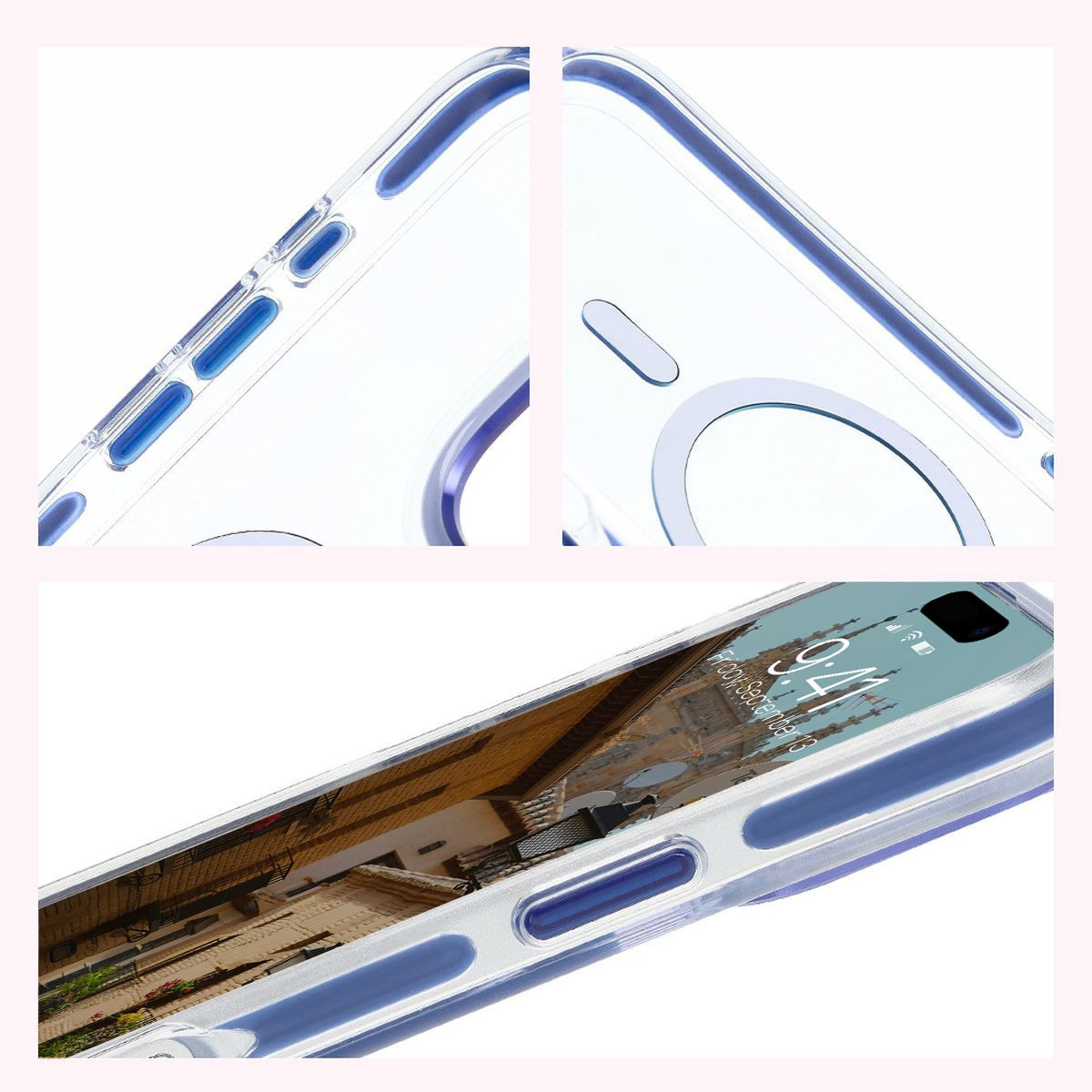 Etui z pierścieniem magnetycznym Bizon Case Marco do iPhone 16 Pro, przezroczyste z niebieską ramką