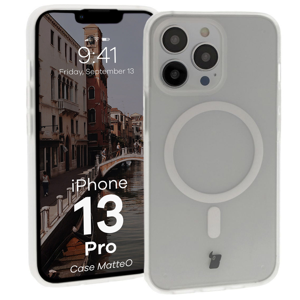 Etui z pierścieniem magnetycznym Bizon Case MatteO do iPhone 13 Pro, półprzezroczyste z przezroczystą ramką