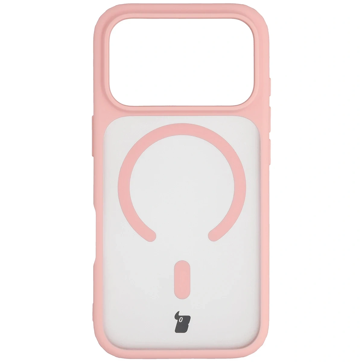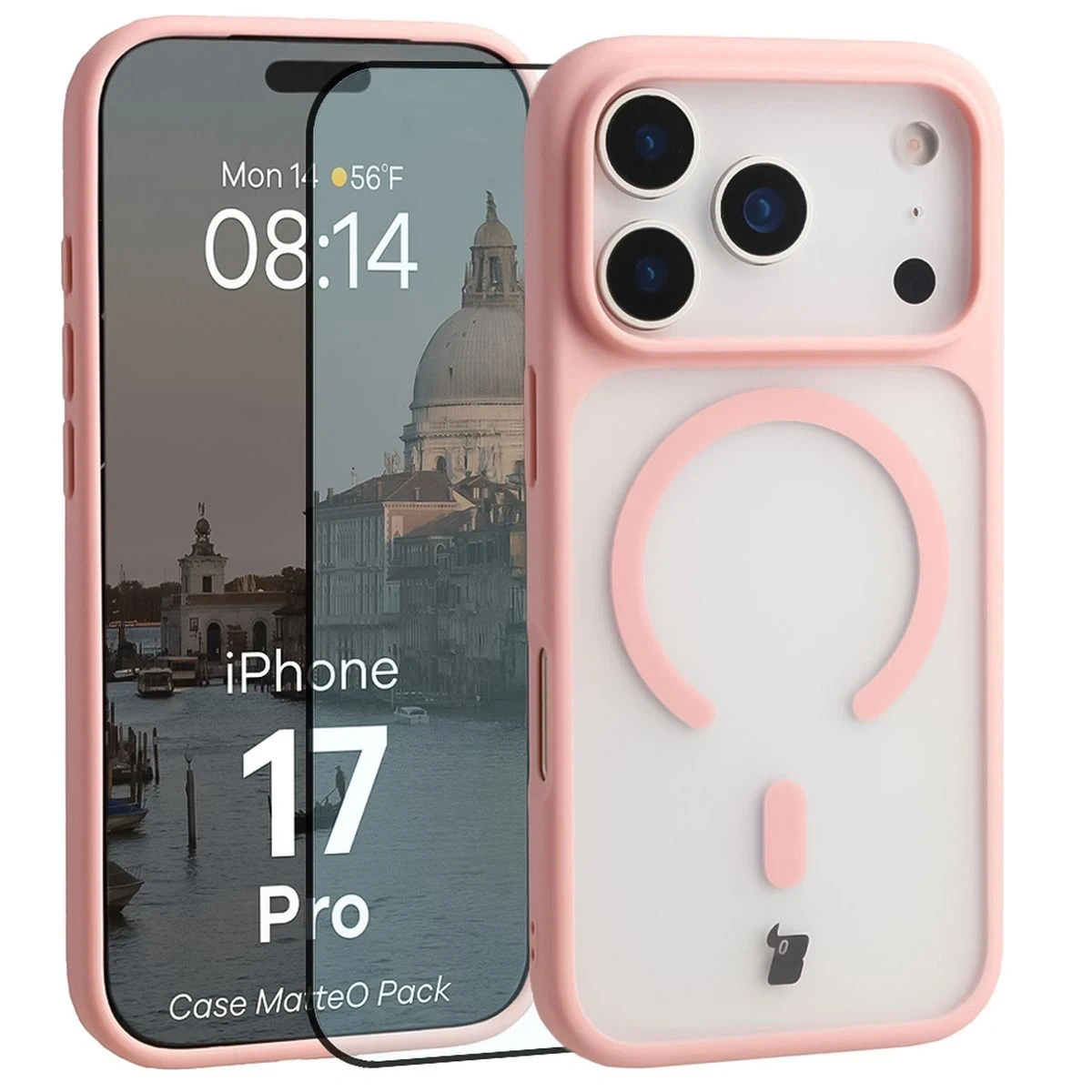 Etui z pierścieniem magnetycznym + szkło hartowane Bizon MatteO Pack do iPhone 17 Pro, przydymione-jasnoróżowe