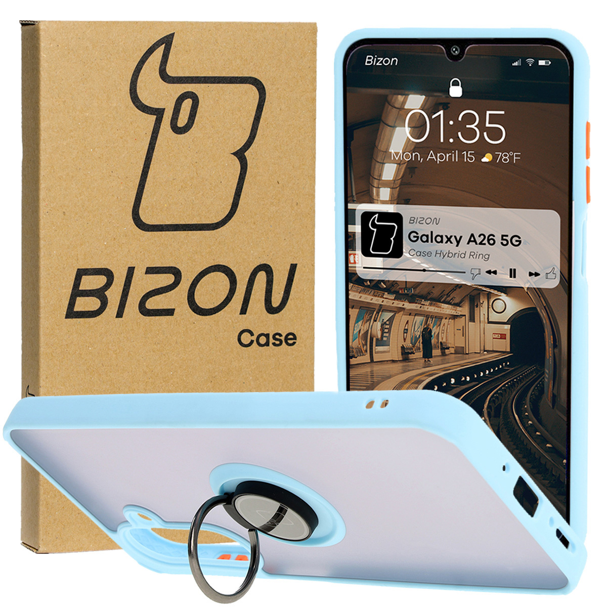 Etui z uchwytem na palec Bizon Case Hybrid Ring do Galaxy A26 5G, przydymione z jasnoniebieską ramką