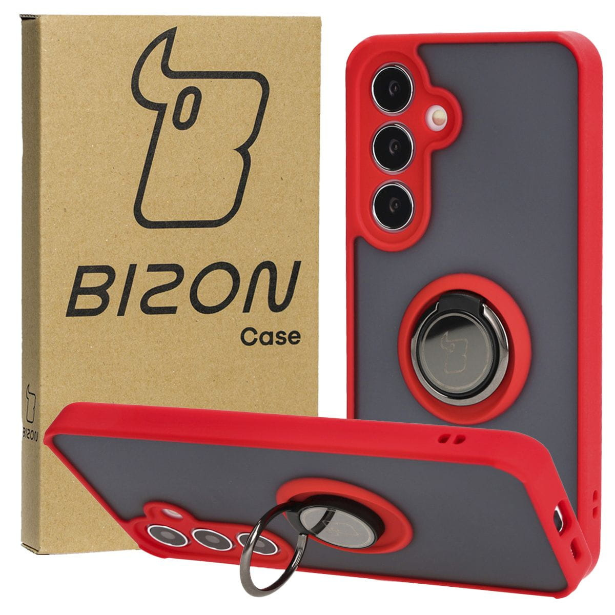 Etui z uchwytem na palec Bizon Case Hybrid Ring do Galaxy S25 / S24, przydymione z czerwoną ramką