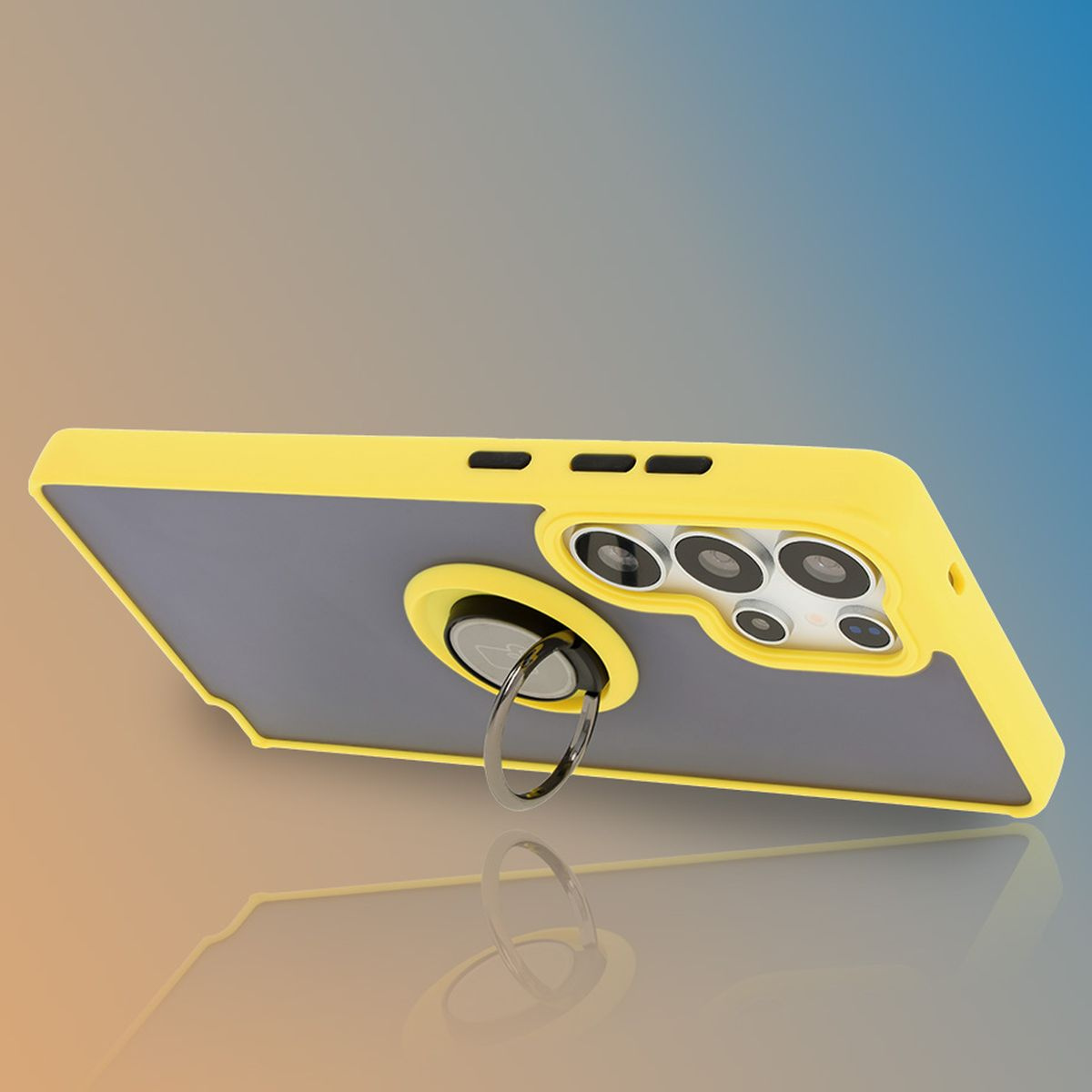 Etui z uchwytem na palec Bizon Case Hybrid Ring do Galaxy S25 Ultra, przydymione z żółtą ramką