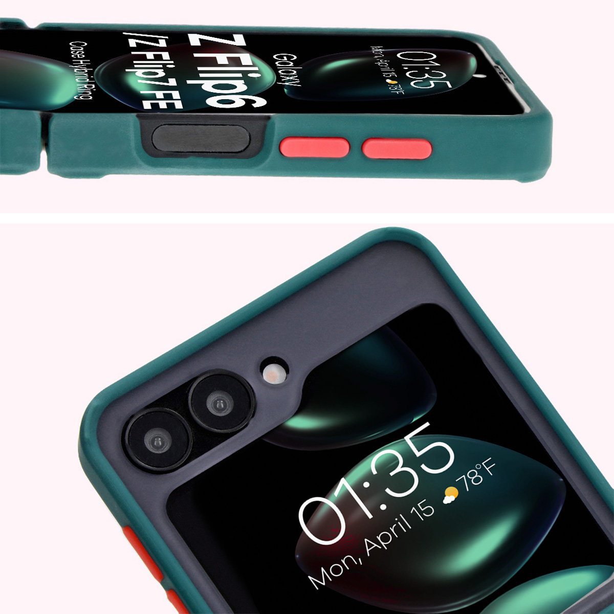 Etui z uchwytem na palec Bizon Case Hybrid Ring do Galaxy Z Flip7 FE / Z Flip6, przydymione z ciemnozieloną ramką