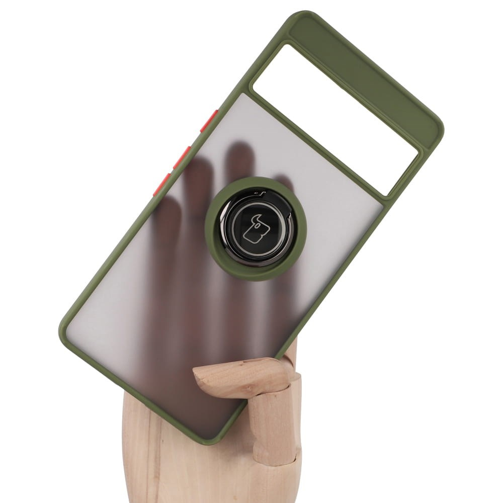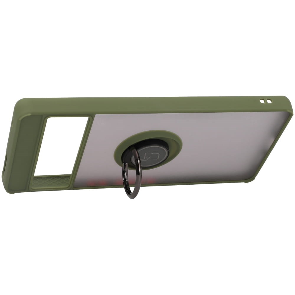Etui z uchwytem na palec Bizon Case Hybrid Ring do Google Pixel 7 Pro, przydymione z zieloną ramką