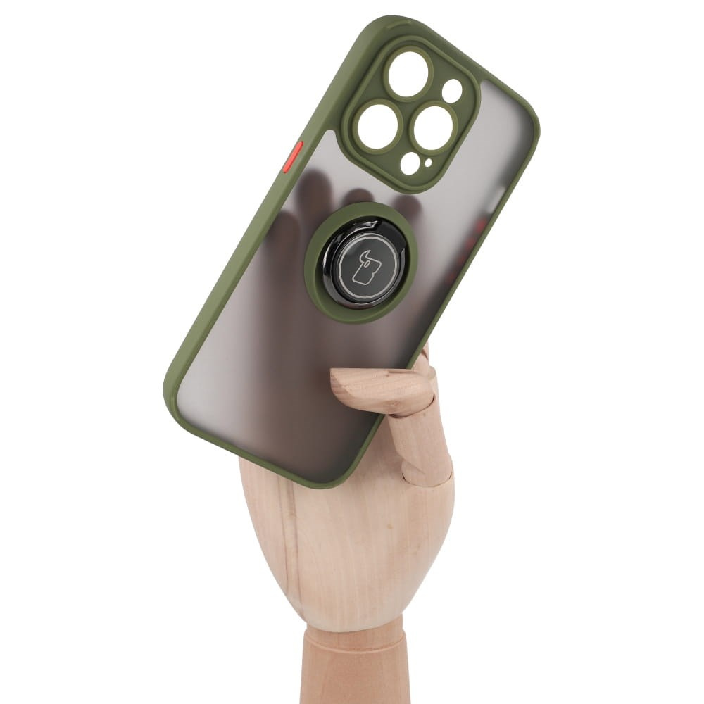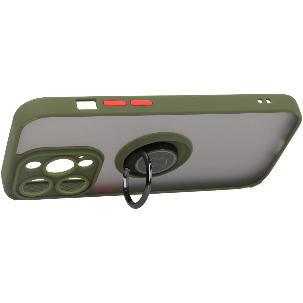 Etui z uchwytem na palec Bizon Case Hybrid Ring do iPhone 14 Pro, przydymione z zieloną ramką