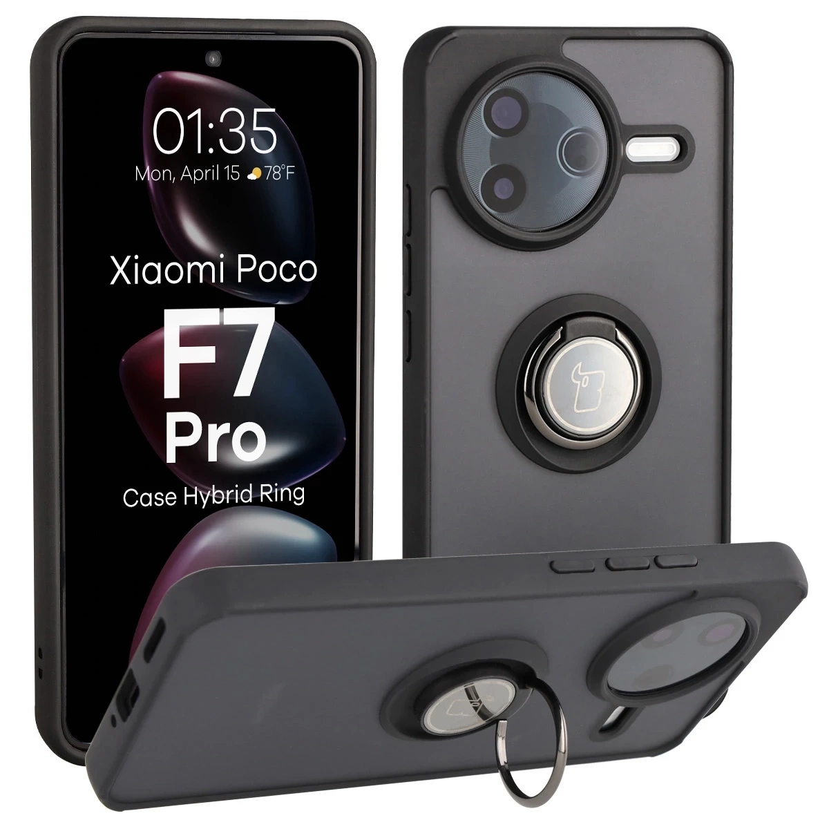 Etui z uchwytem na palec Bizon Case Hybrid Ring do Xiaomi POCO F7 Pro, przydymione z czarną ramką