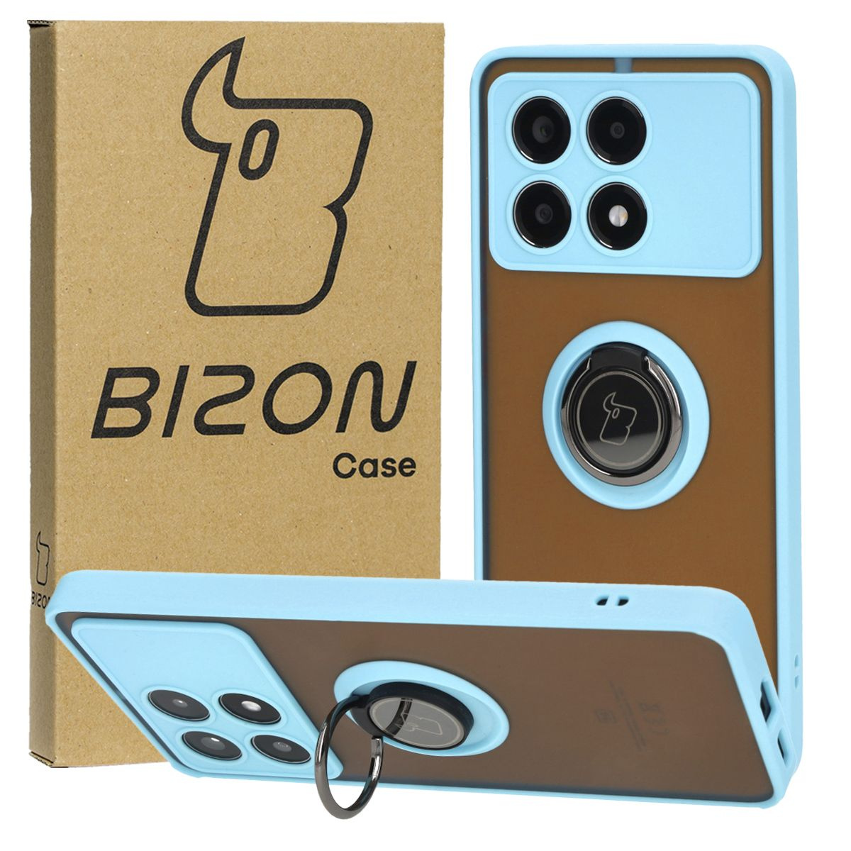 Etui z uchwytem na palec Bizon Case Hybrid Ring do Xiaomi Poco X6 Pro, przydymione z jasnoniebieską ramką